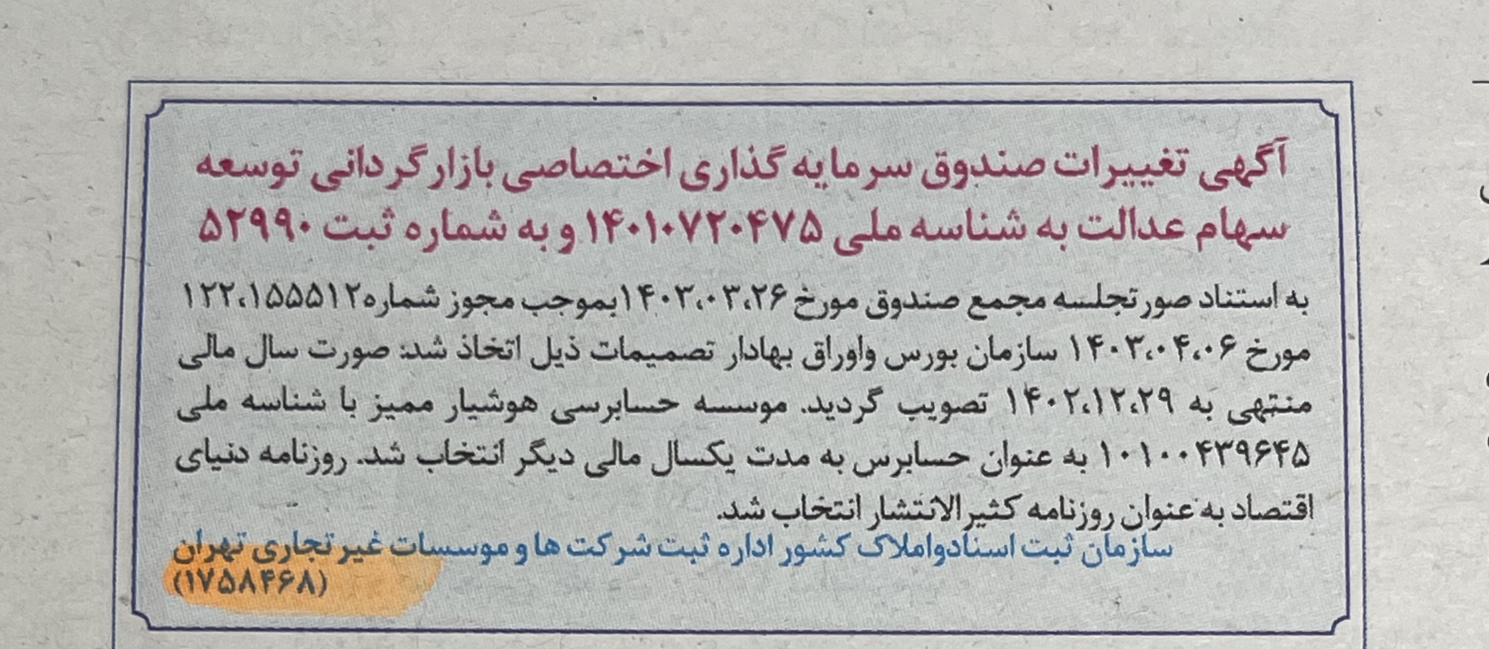 آگهی تغییرات صاحبان امضای مجاز صندوق